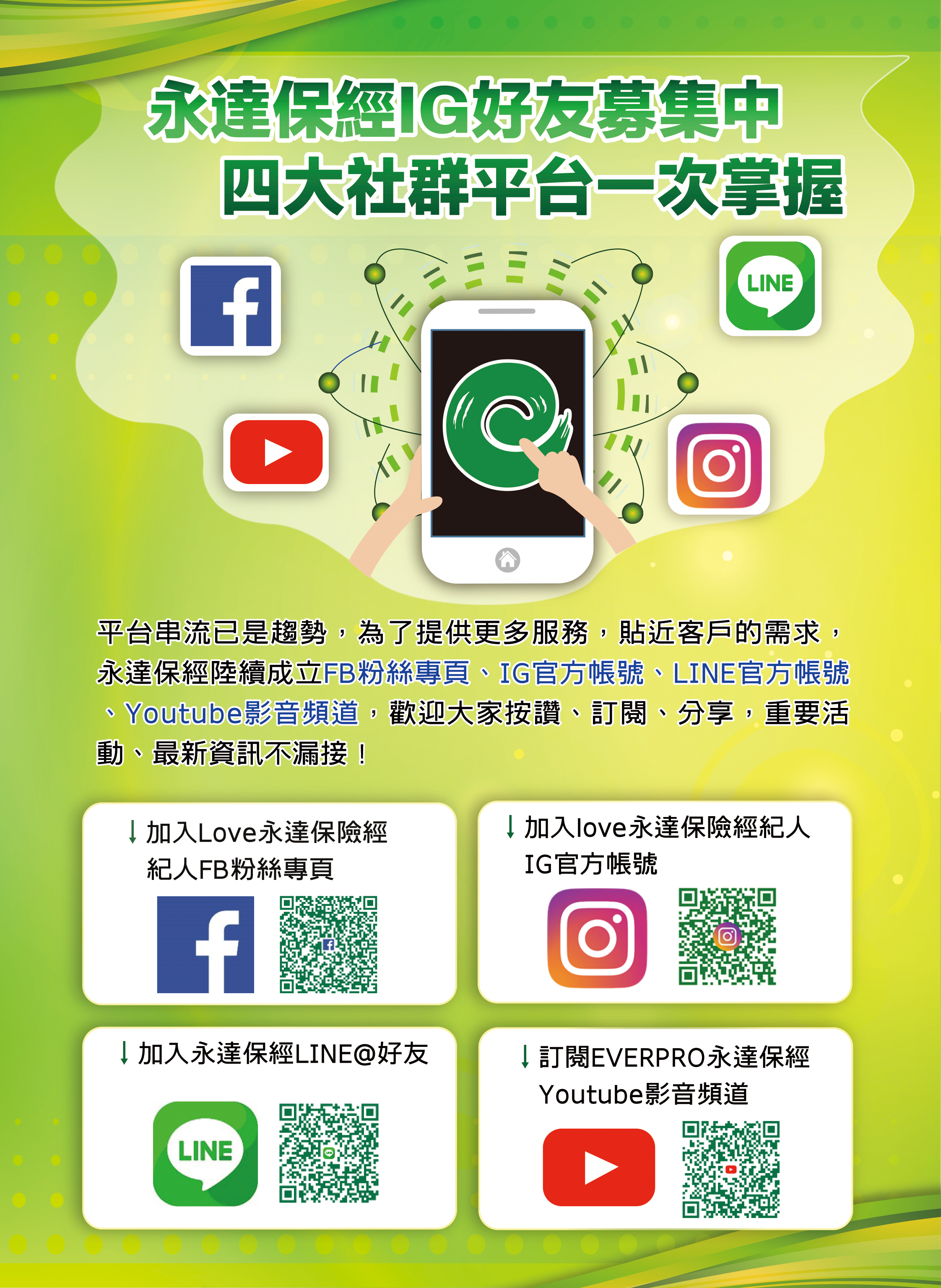 平台串流已是趨勢,為了提供更多服務,貼近客戶的需求,永達保經陸續成立FB粉絲專頁、IG官方帳號、LINE官方帳號、Youtube影音頻道,歡迎大家按讚、訂閱、分享,重要活動、最新資訊不漏接!