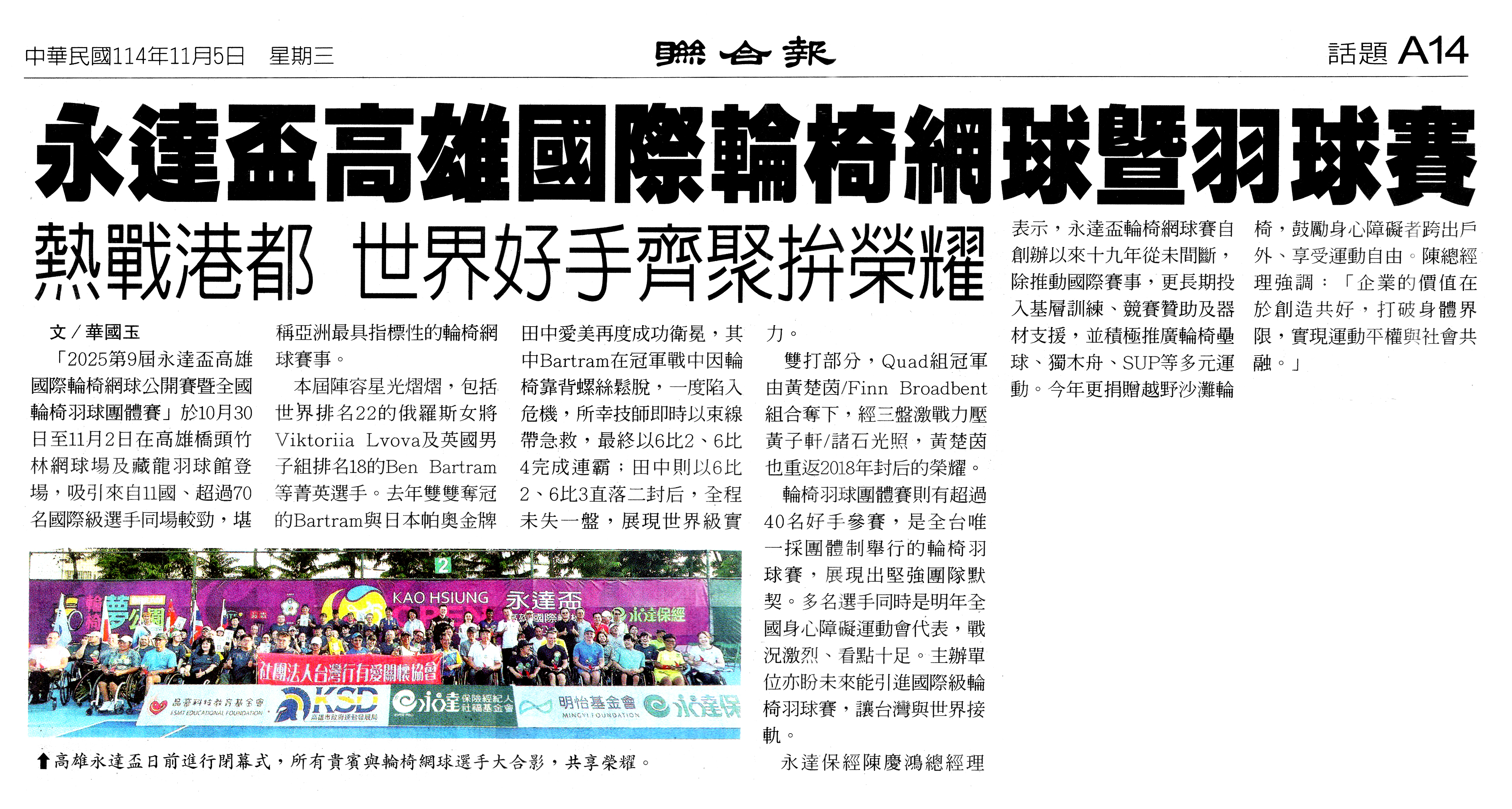 • 【聯合報】永達盃高雄國際輪椅網球暨羽球賽