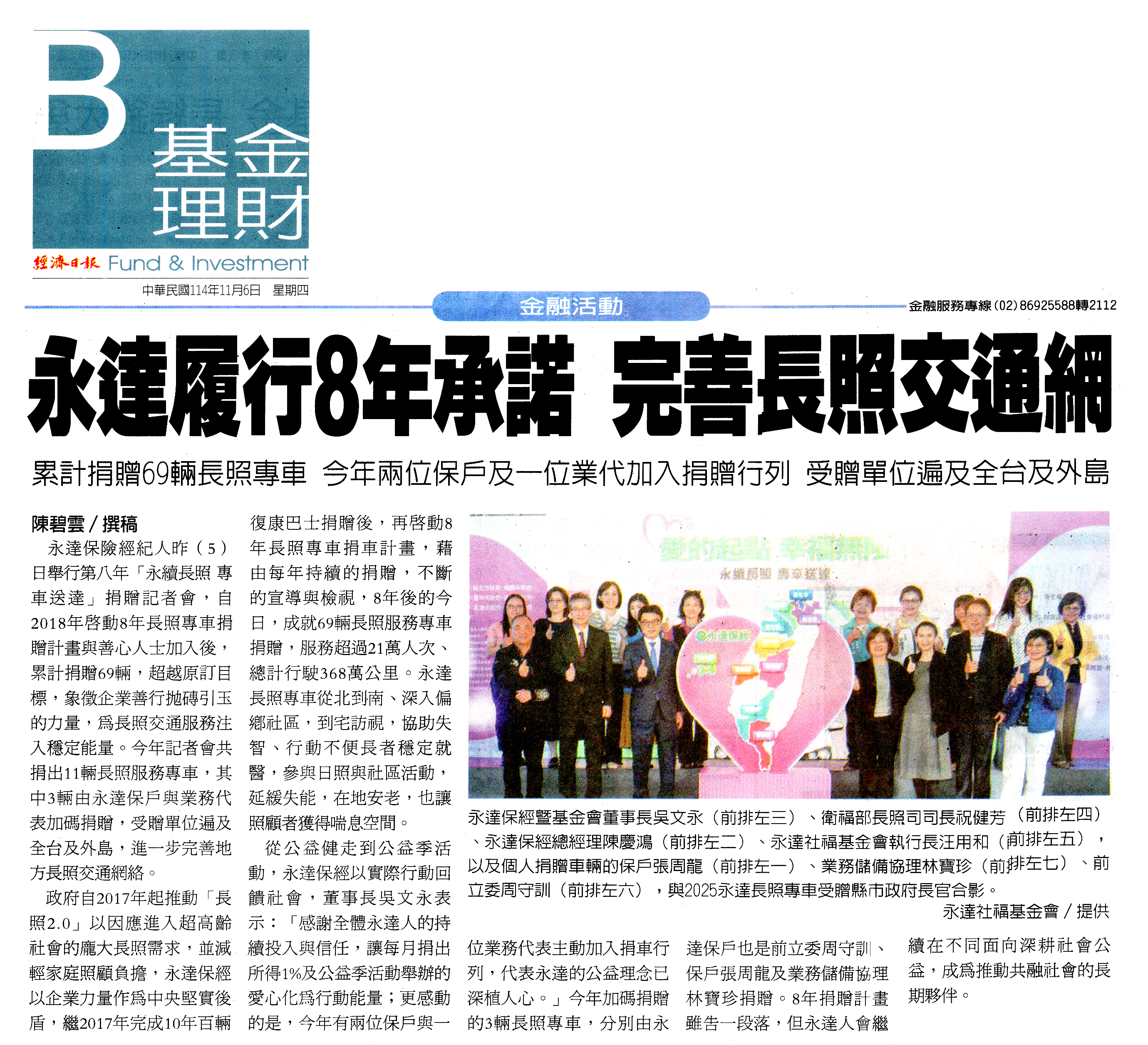 • 【經濟日報】永達履行八年承諾 超越目標共捐贈69輛長照專車