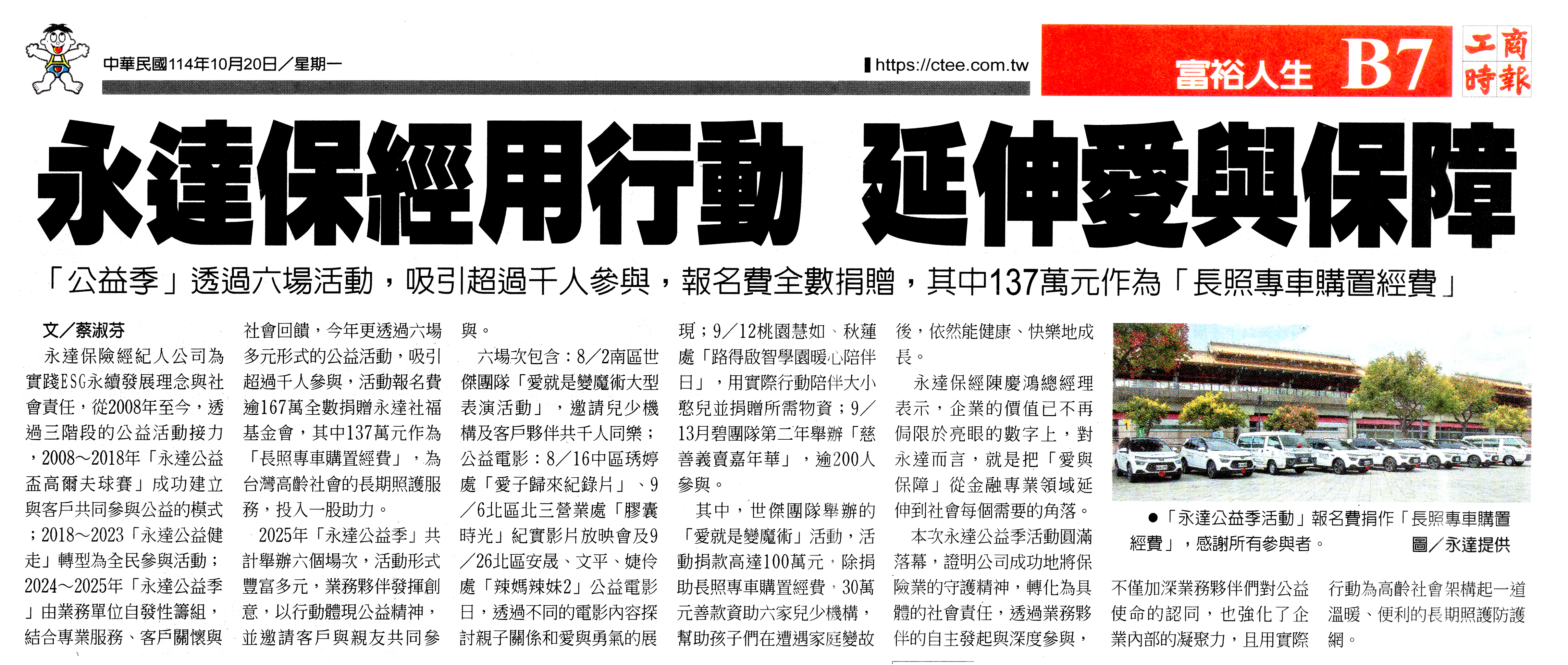 永達保險經紀人公司為實踐ESG永續發展理念與社會責任,從2008年至今,透過三階段的公益活動接力,2008~2018年「永達公益盃高爾夫球賽」成功建立與客戶共同參與公益的模式;2018~2023「永達公益健走」轉型為全民參與活動;2024~2025年「永達公益季」由業務單位自發性籌組,結合專業服務、客戶關懷與社會回饋,今年更透過六場多元形式的公益活動,吸引超過千人參與,活動報名費逾167萬全數捐贈永達社福基金會,其中137萬元作為「長照專車購置經費」,為台灣高齡社會的長期照護服務,投入一股助力。...(詳報導如下)