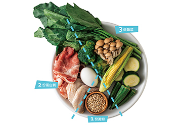 ▲選擇好食材,並依照蔬菜3:蛋白質2:澱粉1的比例先抓量。