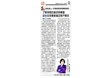 新聞中心 | 2023年《保險達人》永達保經業務籌備協理 了解保險的美好與價值 劉秋英用專業滿足客戶需求 【工商時報】 2023.05.21要如何形容這位氣質優雅的美女,歷經補習班老師、服飾店的老闆娘,轉身成為壽險業菁英;永達保經業務籌備協理劉秋英在接觸保險後,了解保險獨有的價值,初期在傳統大型保險公司就締造了傲人的業績;後來,接觸永達保經後發現,原來要充分發揮保險價值,更需要全方位的專業素養,而永達保經的訓練平台正是業界最佳培育專業人才的地方…(詳報導如下)