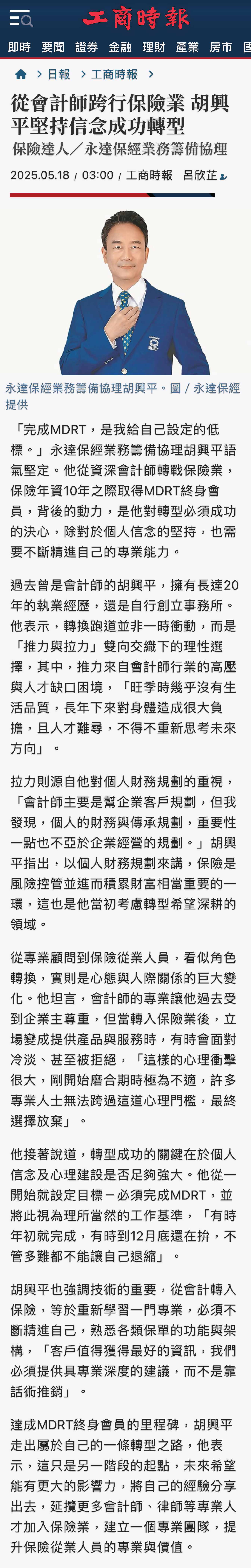 新聞中心 | 2025年《保險達人》永達保經業務籌備協理 從會計師跨行保險業 胡興平堅持信念成功轉型 【工商時報網路新聞】 2025.05.18「完成MDRT,是我給自己設定的低標。」永達保經業務籌備協理胡興平語氣堅定。他從資深會計師轉戰保險業,保險年資10年之際取得MDRT終身會員,背後的動力,是他對轉型必須成功的決心,除對於個人信念的堅持,也需要不斷精進自己的專業能力。…(詳報導如下)