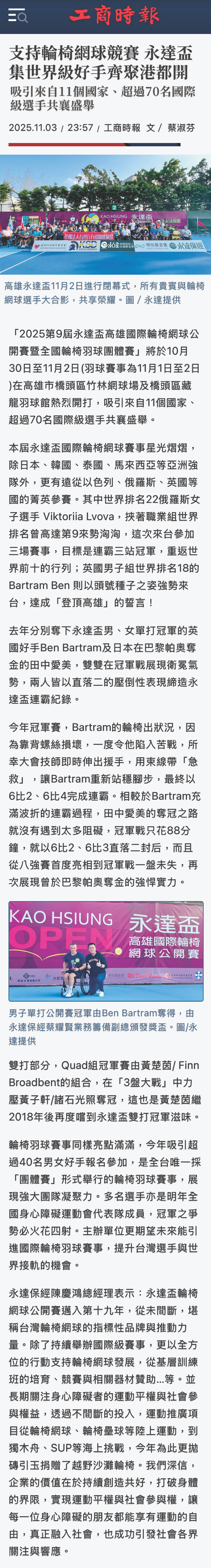 新聞中心 | 2025年支持輪椅網球競賽 永達盃集世界級好手齊聚港都開 【工商時報網路新聞】 2025.11.03「2025第9屆永達盃高雄國際輪椅網球公開賽暨全國輪椅羽球團體賽」將於10月30日至11月2日(羽球賽事為11月1日至2日 )在高雄市橋頭區竹林網球場及橋頭區藏龍羽球館熱烈開打,吸引來自11個國家、超過70名國際級選手共襄盛舉。…永達保經陳慶鴻總經理表示:永達盃輪椅網球公開賽邁入第十九年,從未間斷…(詳報導如下)