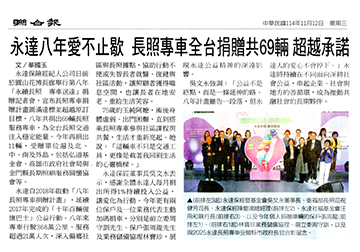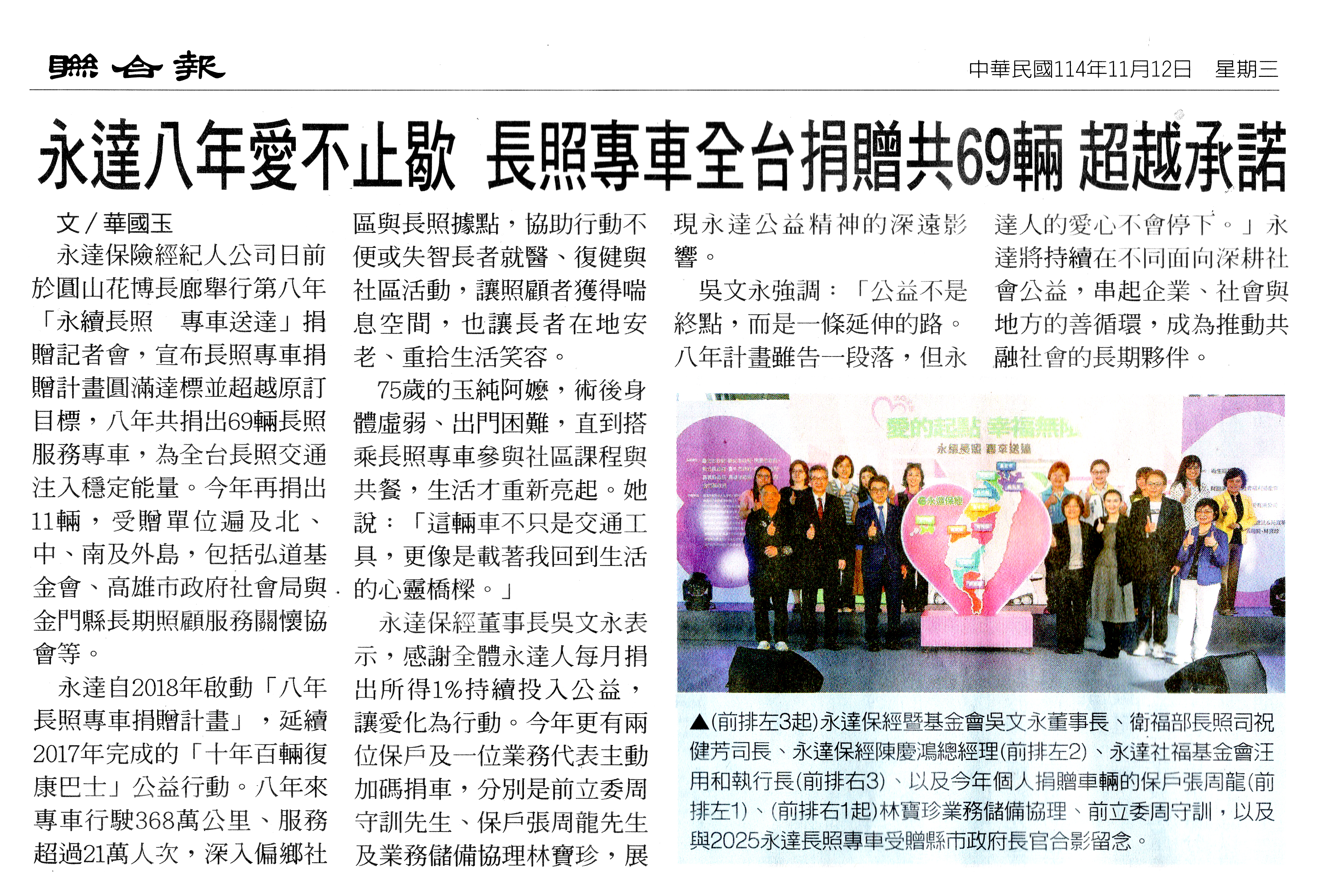 新聞中心 | 2025年永達八年愛不止歇 長照專車全台捐贈共69輛 超越承諾 【聯合報】 2025.11.12永達保險經紀人公司日前於圓山花博長廊舉行第八年「永續長照 專車送達」捐贈記者會,宣布長照專車捐贈計畫圓滿達標並超越原訂目標,八年共捐出69輛長照服務車,為全台長照交通注入穩定能量。…(詳報導如下)