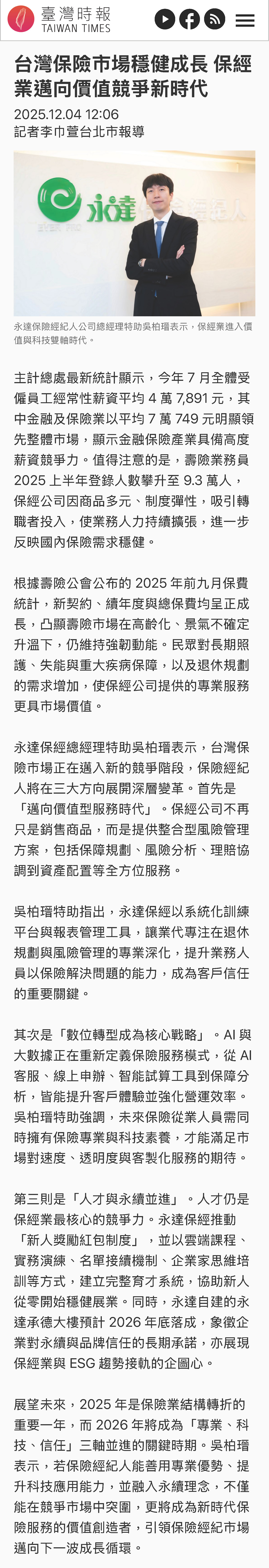 新聞中心 | 2025年台灣保險市場穩健成長 保經業邁向價值競爭新時代 【臺灣時報網路新聞】 2025.12.04永達保經總經理特助吳柏瑨表示,台灣保險市場正在邁入新的競爭階段,保險經紀人將在三大方向展開深層變革。首先是「邁向價值型服務時代」。保經公司不再只是銷售商品,而是提供整合型風險管理方案,包括保障規劃、風險分析、理賠協調到資產配置等全方位服務。…(詳報導如下)
