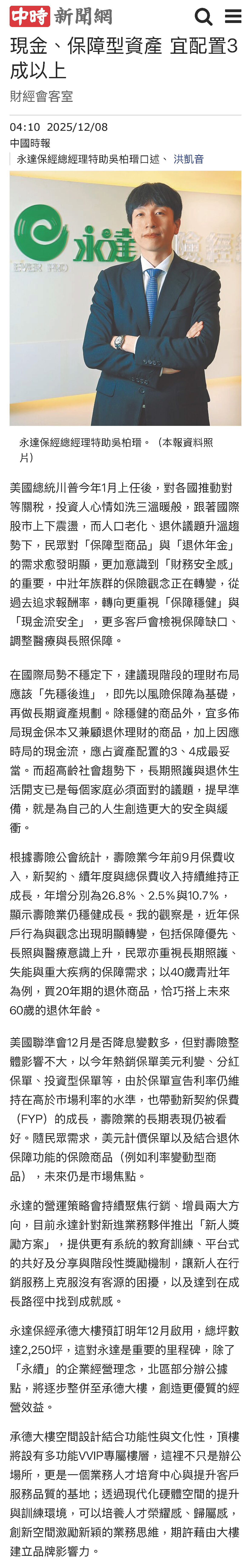 永達的營運策略會持續聚焦行銷、增員兩大方向,目前永達針對新進業務夥伴推出「新人獎勵方案」,提供更有系統的教育訓練、平台式的共好及分享與階段性獎勵機制,讓新人在行銷服務上克服沒有客源的困擾,以及達到在成長路徑中找到成就感。…(詳報導如下)