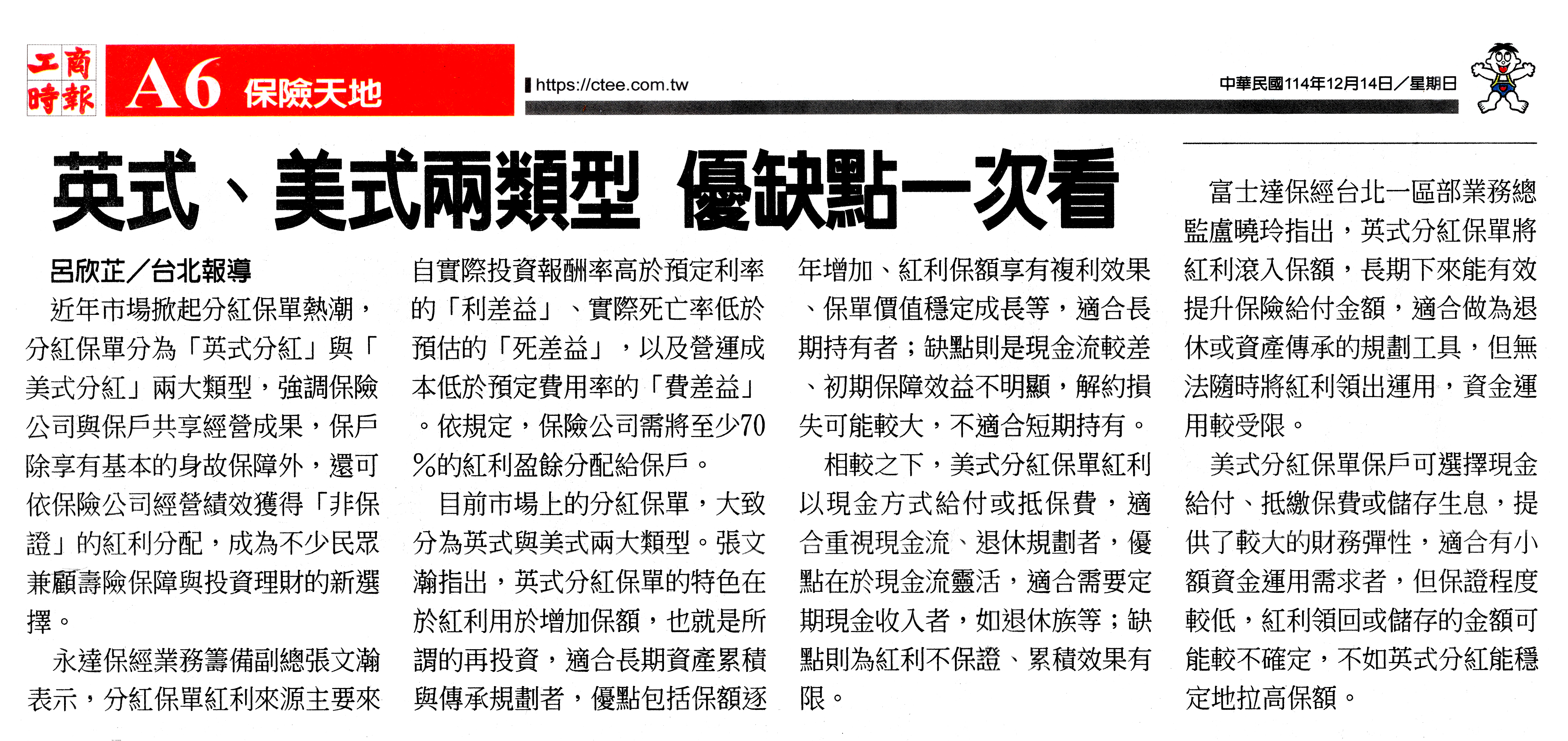 新聞中心 | 2025年《分紅保單》英式、美式兩類型 優缺點一次看 【工商時報】 2025.12.14近年市場掀起分紅保單熱潮,分紅保單分為「英式分紅」與「美式分紅」兩大類型,強調保險公司與保戶共享經營成果…永達保經業務籌備副總張文瀚表示,分紅保單紅利來源主要來自實際投資報酬率高於預定利率的「利差益」、實際死亡率低於預估的「死差益」,以及營運成本低於預定費用率的「費差益」。依規定,保險公司需將至少70%的紅利盈餘分配給保戶。…(詳報導如下)