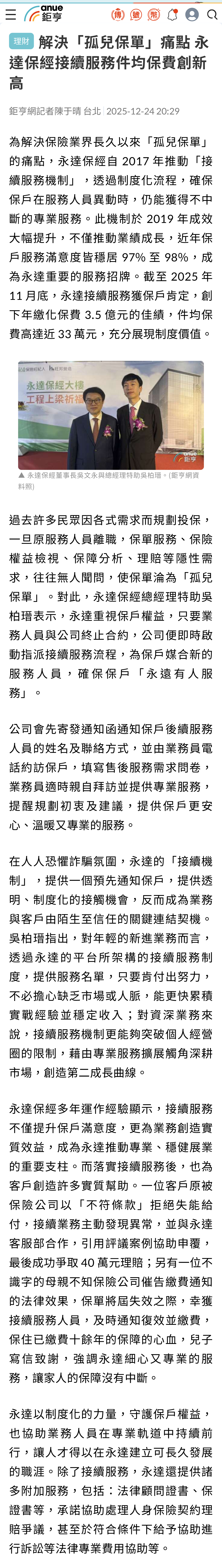 新聞中心 | 2025年解決「孤兒保單」痛點 永達保經續服務件均保費創新高 【鉅亨網】 2025.12.24為解決保險業界長久以來「孤兒保單」的痛點,永達保經自 2017 年推動「接續服務機制」,透過制度化流程,確保保戶在服務人員異動時,仍能獲得不中斷的專業服務。此機制於 2019 年成效大幅提升,不僅推動業績成長,近年保戶服務滿意度皆穩居 97% 至 98%,成為永達重要的服務招牌。截至 2025 年 11 月底,永達接續服務獲保戶肯定,創下年繳化保費 3.5 億元的佳績,件均保費高達近 33 萬元,充分展現制度價值。…(詳報導如下)