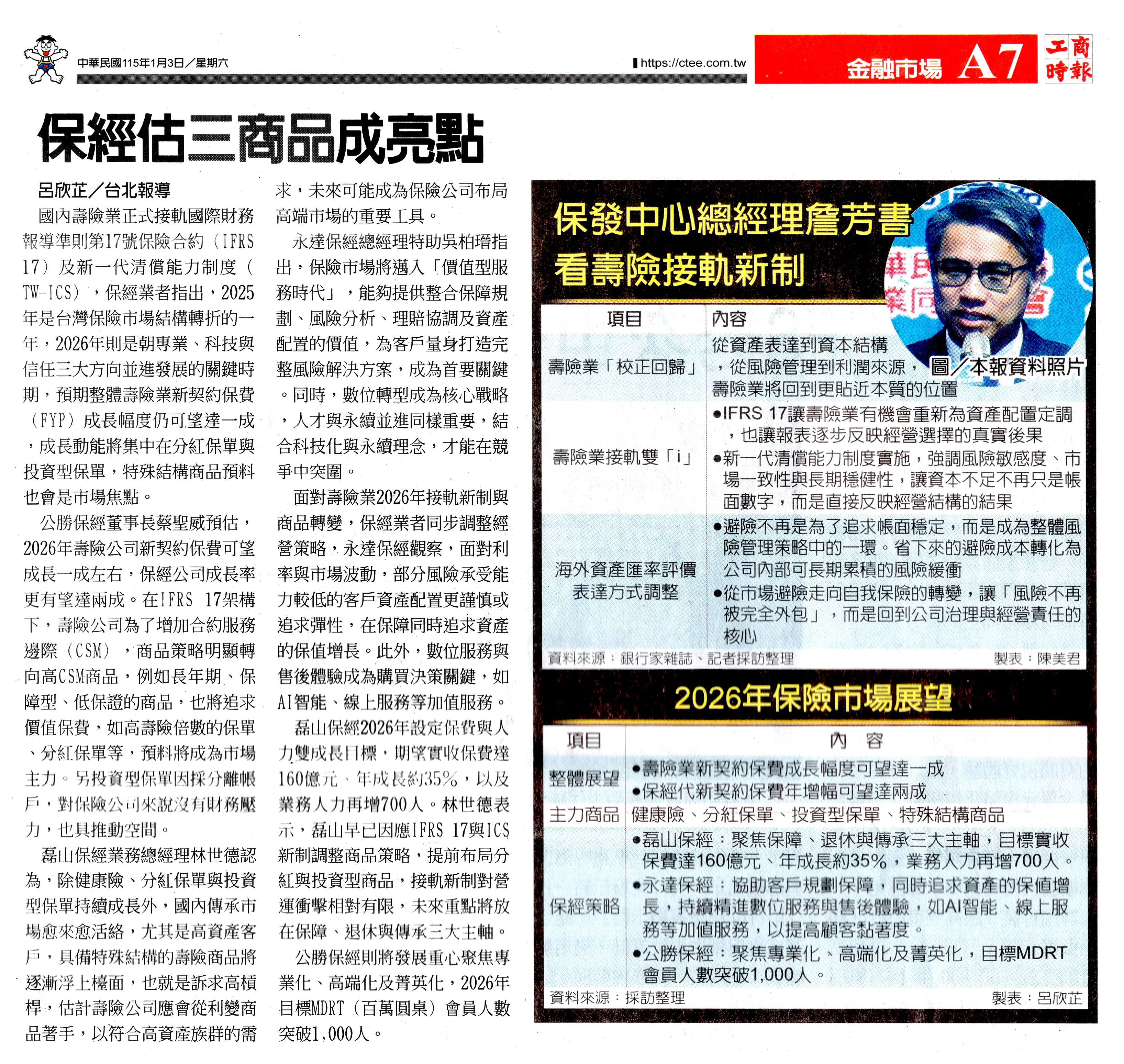 新聞中心 | 2025年壽險接軌新制 保經估三商品成亮點 【工商時報】 2026.01.03國內壽險業正式接軌國際財務報導準則第17號保險合約(IFRS 17)及新一代清償能力制度(TW-ICS)…永達保經總經理特助吳柏指出,保險市場將邁入「價值型服務時代」,能夠提供整合保障規劃、風險分析、理賠協調及資產配置的價值,為客戶量身打造完整風險解決方案,成為首要關鍵。同時,數位轉型成為核心戰略,人才與永續並進同樣重要,結合科技化與永續理念,才能在競爭中突圍。…(詳報導如下)