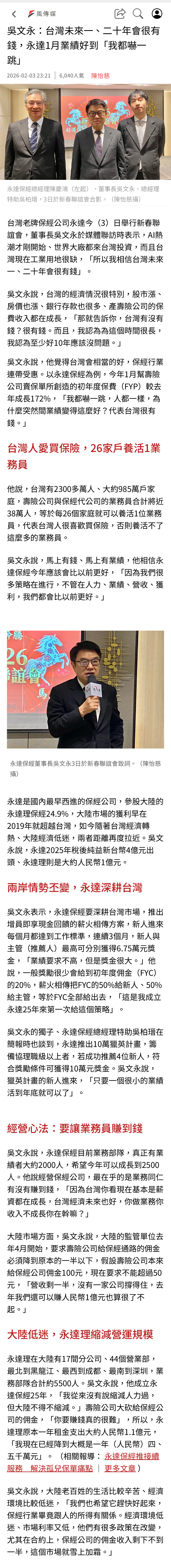 新聞中心 | 2025年吳文永:台灣未來一、二十年會很有錢,永達1月業績好到「我都嚇一跳」 【風傳媒】 2026.02.03台灣老牌保經公司永達今(3)日舉行新春聯誼會,董事長吳文永於媒體聯訪時表示,AI熱潮才剛開始、世界大廠都來台灣投資,而且台灣現在工業用地很缺,「所以我相信台灣未來一、二十年會很有錢」。…(詳報導如下)