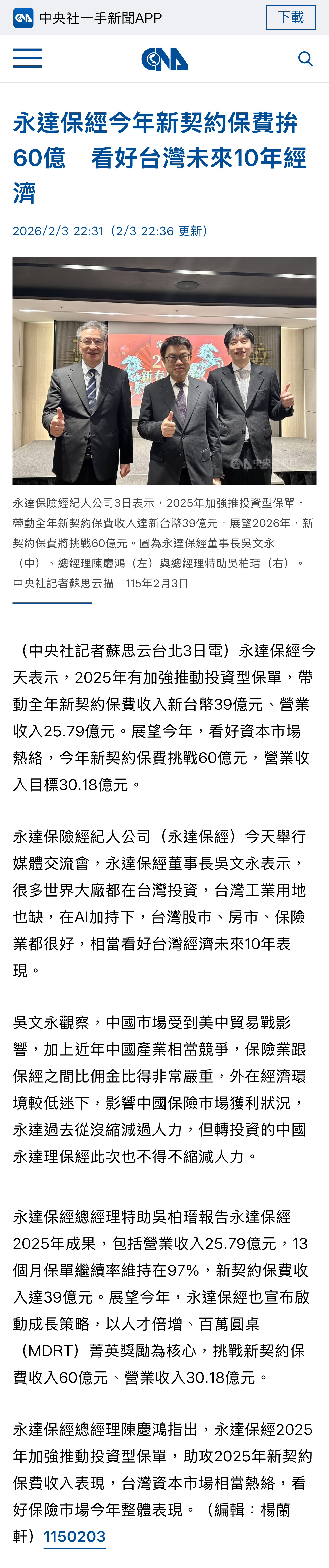 新聞中心 | 2025年永達保經 2026年挑戰新契約保費60億元 【中央社】 2026.02.03永達保經今天表示,2025年有加強推動投資型保單,帶動全年新契約保費收入新台幣39億元、營業收入25.79億元。展望今年,看好資本市場熱絡,今年新契約保費挑戰60億元,營業收入目標30.18億元。…(詳報導如下)