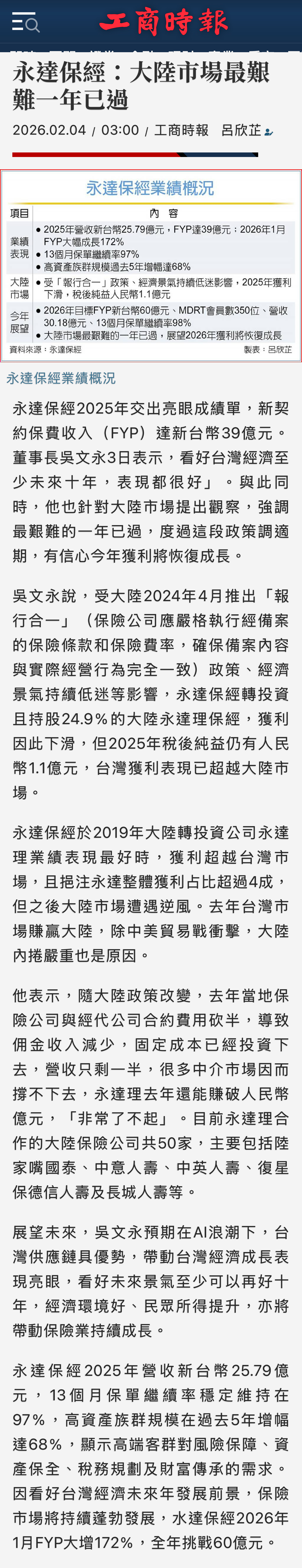 新聞中心 | 2025年永達保經:大陸市場最艱難一年已過 【工商時報網路新聞】 2026.02.04永達保經2025年交出亮眼成績單,新契約保費收入(FYP)達新台幣39億元。董事長吳文永3日表示,看好台灣經濟至少未來十年,表現都很好」。與此同時,他也針對大陸市場提出觀察,強調最艱難的一年已過,度過這段政策調適期,有信心今年獲利將恢復成長。…(詳報導如下)