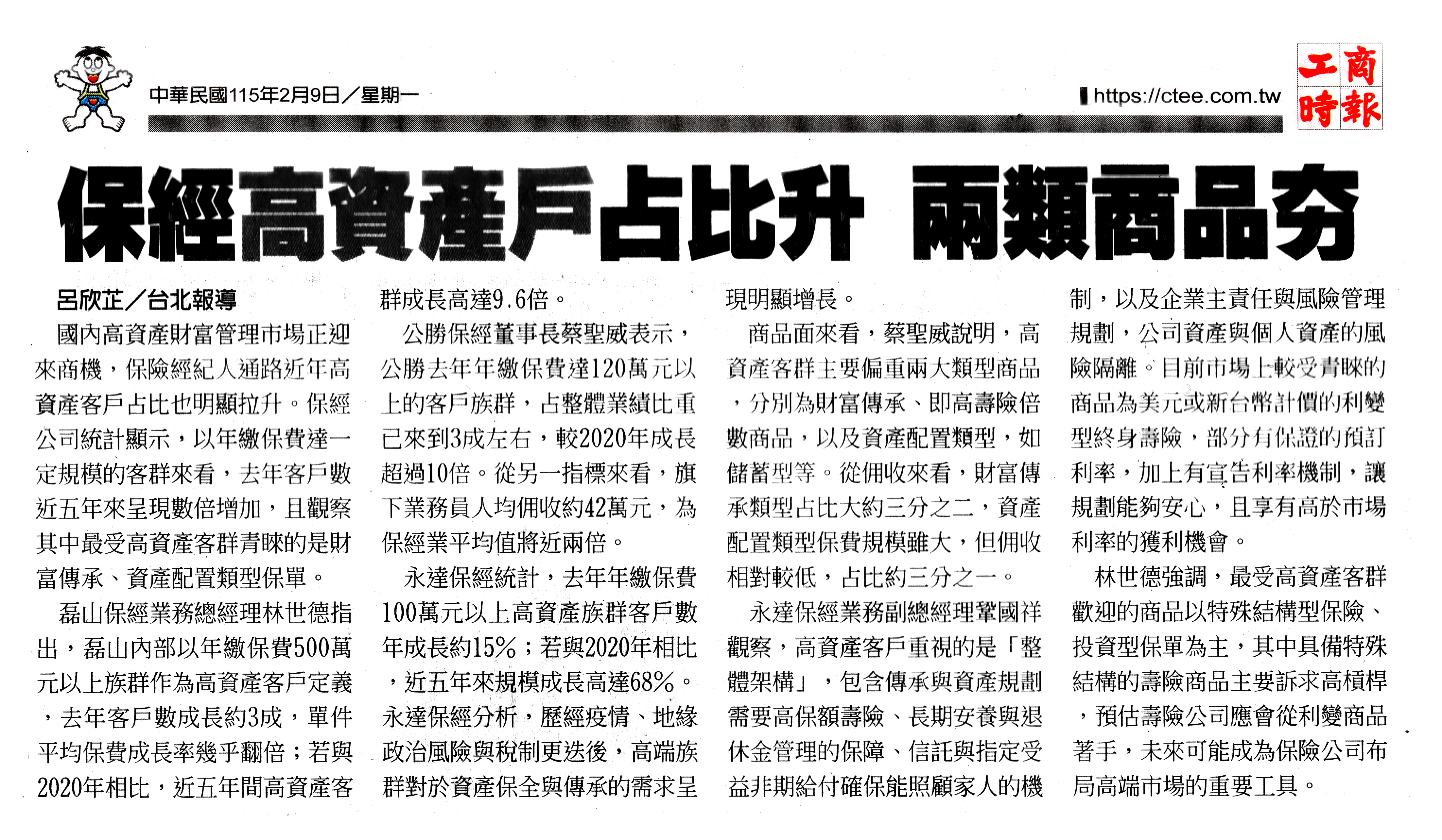新聞中心 | 2025年保經高資產戶占比升 兩類商品夯 【工商時報】 2026.02.09國內高資產財富管理市場正迎來商機,保險經紀人通路近年高資產客戶占比也明顯拉升。…永達保經統計,去年年繳保費100萬元以上高資產族群客戶數年成長約15%;若與2020年相比,近五年來規模成長高達68%。永達保經分析,歷經疫情、地緣政治風險與稅制更迭後,高端族群對於資產保全與傳承的需求呈現明顯增長。…(詳報導如下)