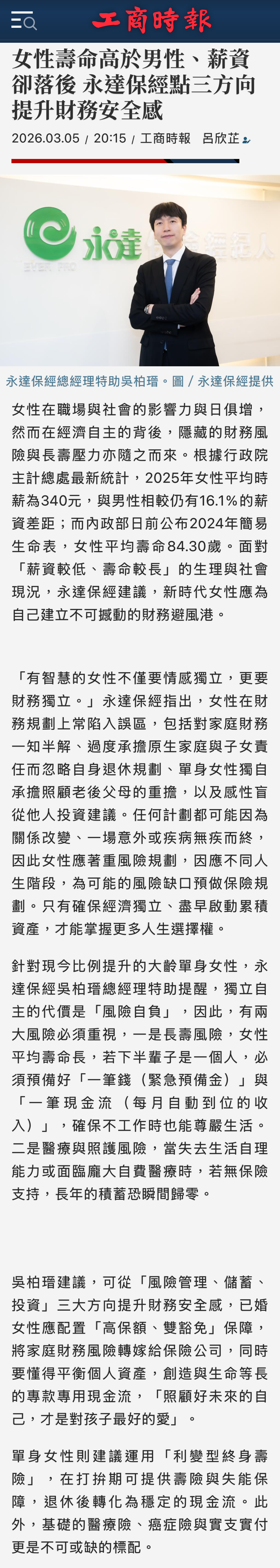 新聞中心 | 2025年女性壽命高於男性、薪資卻落後 永達保經點三方向提升財務安全感 【工商時報網路新聞】 2026.03.05女性在職場與社會的影響力與日俱增,然而在經濟自主的背後,隱藏的財務風險與長壽壓力亦隨之而來。根據行政院主計總處最新統計,2025年女性平均時薪為340元,與男性相較仍有16.1%的薪資差距;而內政部日前公布2024年簡易生命表,女性平均壽命84.30歲。面對「薪資較低、壽命較長」的生理與社會現況,永達保經建議,新時代女性應為自己建立不可撼動的財務避風港。…(詳報導如下)