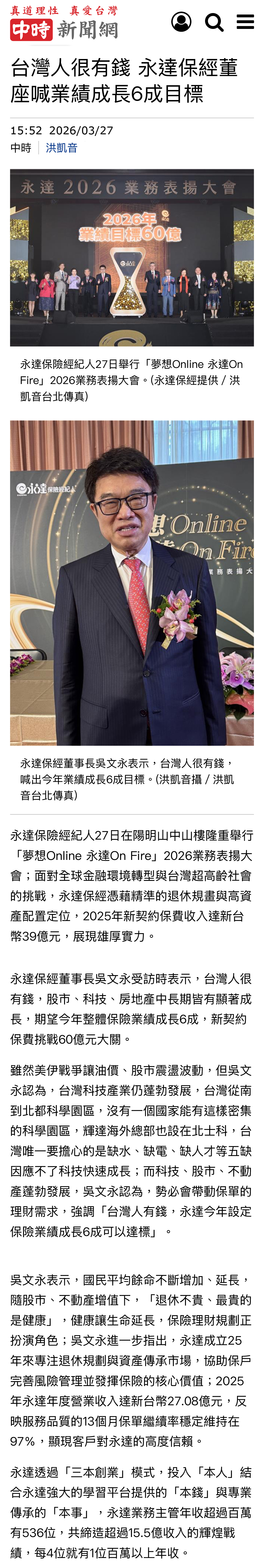 新聞中心 | 2026年台灣人很有錢 永達保經董座喊業績成長6成目標 【中時新聞網】 2026.03.27永達保險經紀人27日在陽明山中山樓隆重舉行「夢想Online 永達On Fire」2026業務表揚大會;面對全球金融環境轉型與台灣超高齡社會的挑戰,永達保經憑藉精準的退休規畫與高資產配置定位,2025年新契約保費收入達新台幣39億元,展現雄厚實力。…(詳報導如下)