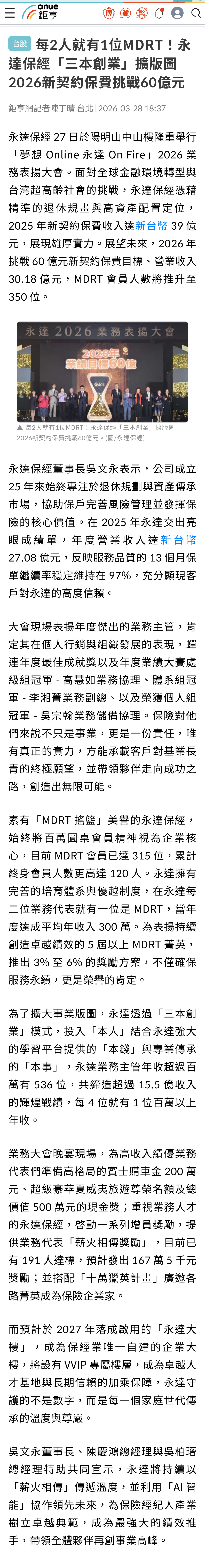 永達保經 27 日於陽明山中山樓隆重舉行「夢想 Online 永達 On Fire」2026 業務表揚大會。面對全球金融環境轉型與台灣超高齡社會的挑戰,永達保經憑藉精準的退休規畫與高資產配置定位,2025 年新契約保費收入達新台幣 39 億元,展現雄厚實力。展望未來,2026 年挑戰 60 億元新契約保費目標、營業收入 30.18 億元,MDRT 會員人數將推升至 350 位。…(詳報導如下)