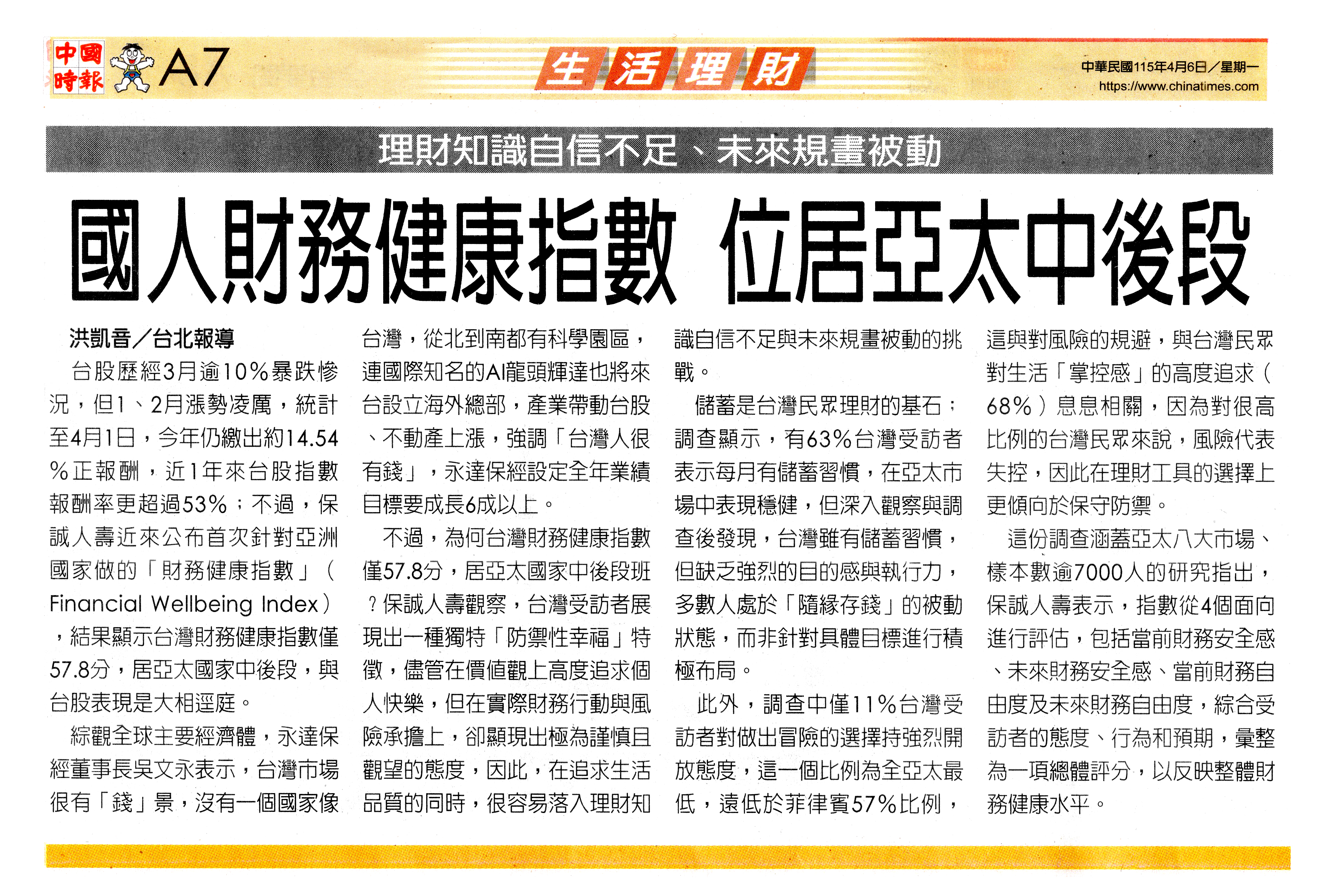 新聞中心 | 2026年國人財務健康指數 位居亞太中後段 【中國時報】 2026.04.06綜觀全球主要經濟體,永達保經董事長吳文永表示,台灣市場很有「錢」景,沒有一個國家像台灣,從北到南都有科學園區,連國際知名的AI龍頭輝達也將來台設立海外總部,產業帶動台股、不動產上漲,強調「台灣人很有錢」,永達保經設定全年業績目標要成長6成以上。…(詳報導如下)