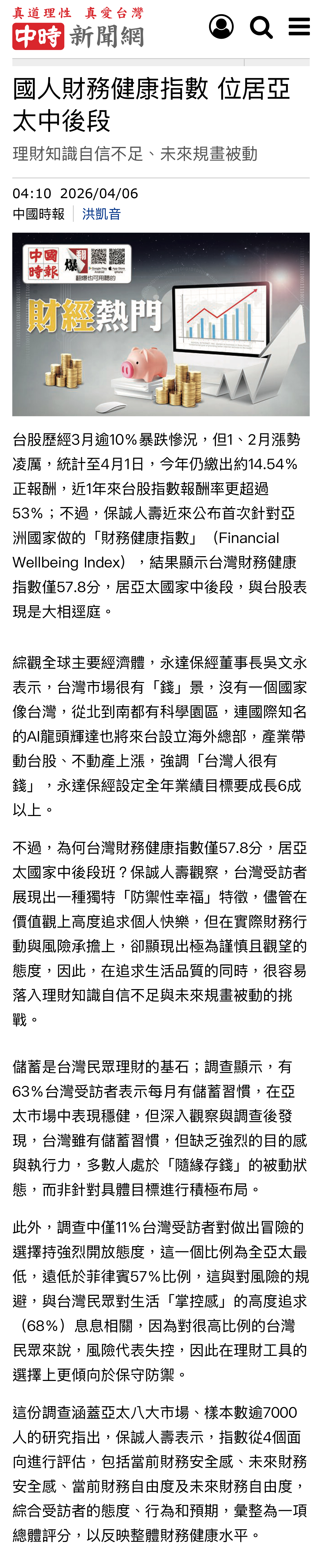 新聞中心 | 2026年國人財務健康指數 位居亞太中後段 【中時新聞網】 2026.04.06綜觀全球主要經濟體,永達保經董事長吳文永表示,台灣市場很有「錢」景,沒有一個國家像台灣,從北到南都有科學園區,連國際知名的AI龍頭輝達也將來台設立海外總部,產業帶動台股、不動產上漲,強調「台灣人很有錢」,永達保經設定全年業績目標要成長6成以上。…(詳報導如下)