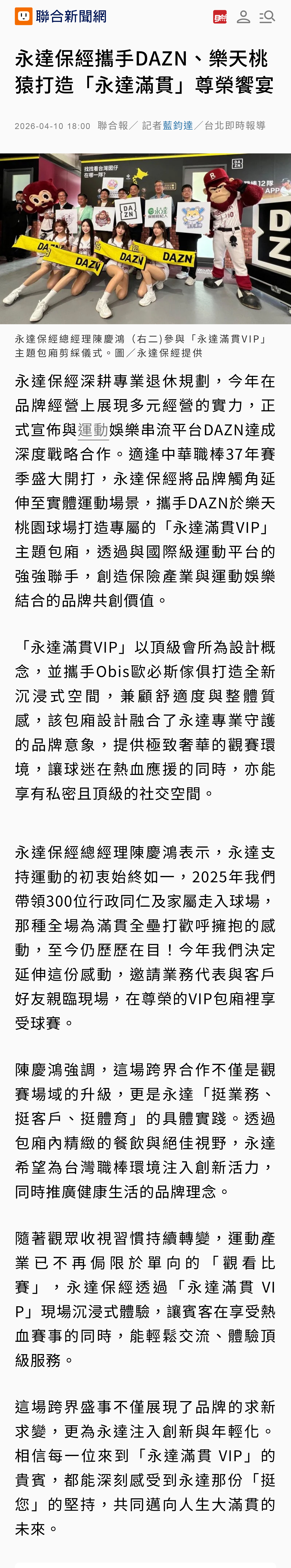 新聞中心 | 2026年永達保經攜手DAZN、樂天桃猿打造「永達滿貫」尊榮饗宴 【聯合新聞網】 2026.04.10永達保經深耕專業退休規劃,今年在品牌經營上展現多元經營的實力,正式宣佈與運動娛樂串流平台DAZN達成深度戰略合作。適逢中華職棒37年賽季盛大開打,永達保經將品牌觸角延伸至實體運動場景,攜手DAZN於樂天桃園球場打造專屬的「永達滿貫VIP」主題包廂,透過與國際級運動平台的強強聯手,創造保險產業與運動娛樂結合的品牌共創價值。…(詳報導如下)