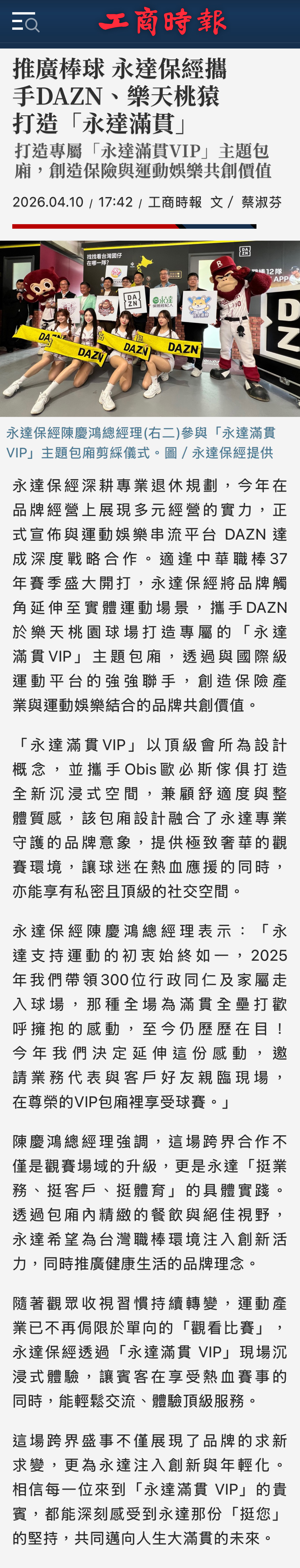 新聞中心 | 2026年推廣棒球 永達保經攜手DAZN、樂天桃猿打造「永達滿貫」 【工商時報網路新聞】 2026.04.10永達保經深耕專業退休規劃,今年在品牌經營上展現多元經營的實力,正式宣佈與運動娛樂串流平台 DAZN 達成深度戰略合作。適逢中華職棒37年賽季盛大開打,永達保經將品牌觸角延伸至實體運動場景,攜手DAZN於樂天桃園球場打造專屬的「永達滿貫VIP」主題包廂,透過與國際級運動平台的強強聯手,創造保險產業與運動娛樂結合的品牌共創價值。…(詳報導如下)