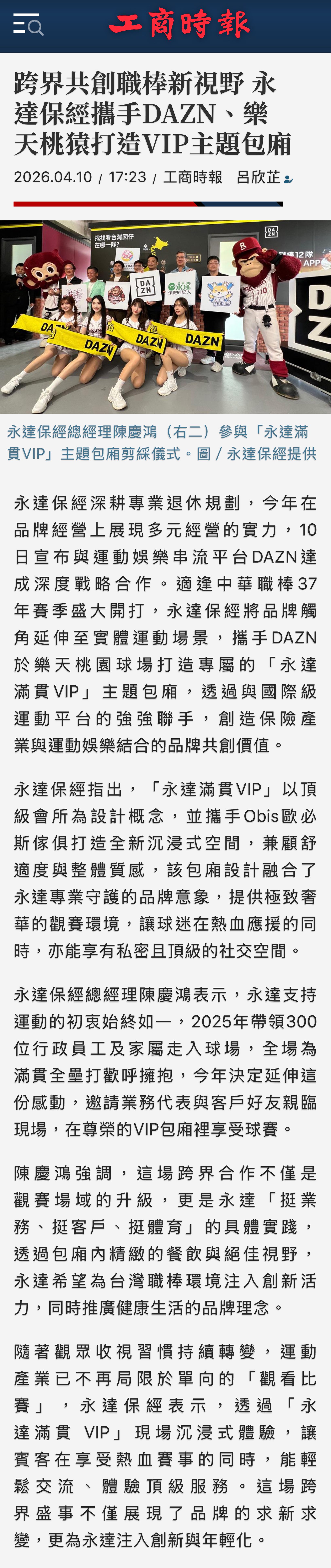 新聞中心 | 2026年跨界共創職棒新視野 永達保經攜手DAZN、樂天桃猿打造VIP主題包廂 【工商時報】 2026.04.10永達保經深耕專業退休規劃,今年在品牌經營上展現多元經營的實力,10日宣布與運動娛樂串流平台DAZN達成深度戰略合作。適逢中華職棒37年賽季盛大開打,永達保經將品牌觸角延伸至實體運動場景,攜手DAZN於樂天桃園球場打造專屬的「永達滿貫VIP」主題包廂,透過與國際級運動平台的強強聯手,創造保險產業與運動娛樂結合的品牌共創價值。…(詳報導如下)