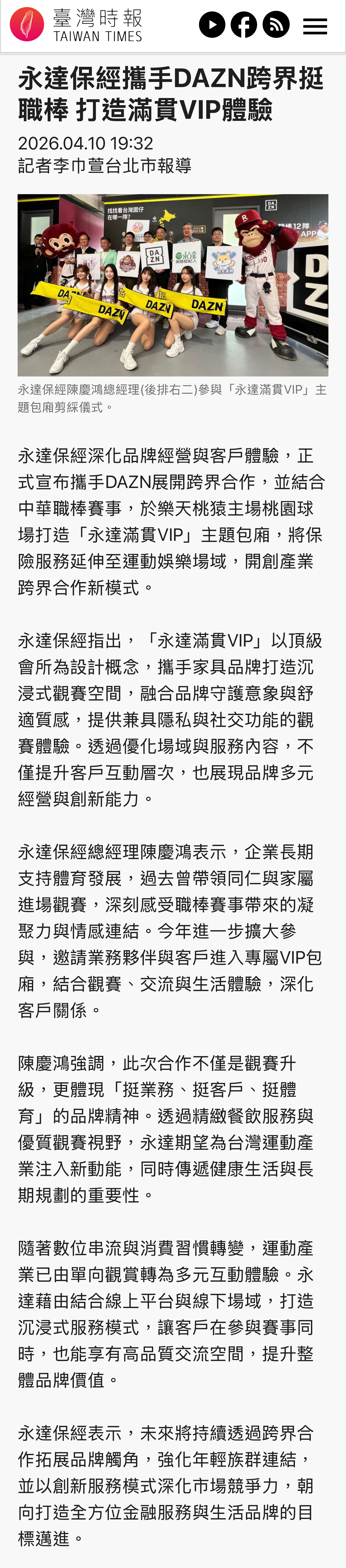 新聞中心 | 2026年永達保經攜手DAZN跨界挺職棒 打造滿貫VIP體驗 【臺灣時報網路新聞】 2026.04.10永達保經深化品牌經營與客戶體驗,正式宣布攜手DAZN展開跨界合作,並結合中華職棒賽事,於樂天桃猿主場桃園球場打造「永達滿貫VIP」主題包廂,將保險服務延伸至運動娛樂場域,開創產業跨界合作新模式。…(詳報導如下)