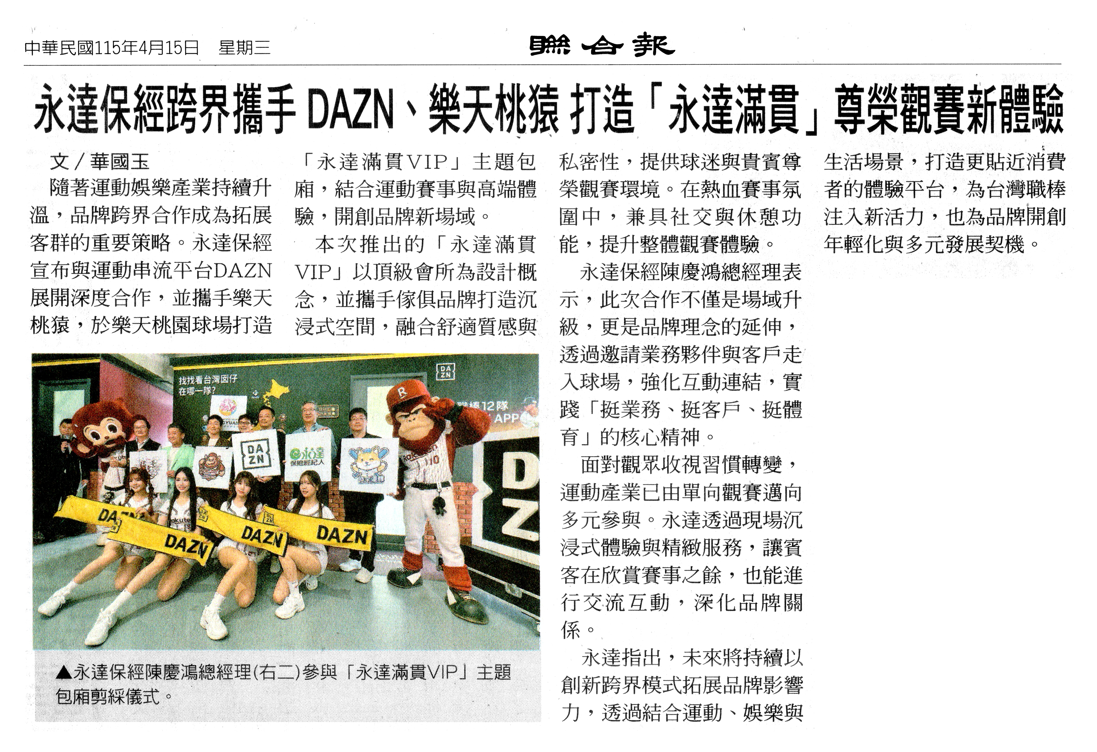 新聞中心 | 2026年永達保經跨界攜手DAZN、樂天桃猿 打造「永達滿貫」尊榮觀賽新體驗 【聯合報】 2026.04.15隨著運動娛樂產業持續升溫,品牌跨界合作成為拓展客群的重要策略。永達保經宣布與運動串流平台DAZN展開深度合作,並攜手樂天桃猿,於樂天桃園球場打造「永達滿貫VIP」主題包廂,結合運動賽事與高端體驗,開創品牌新場域。…(詳報導如下)