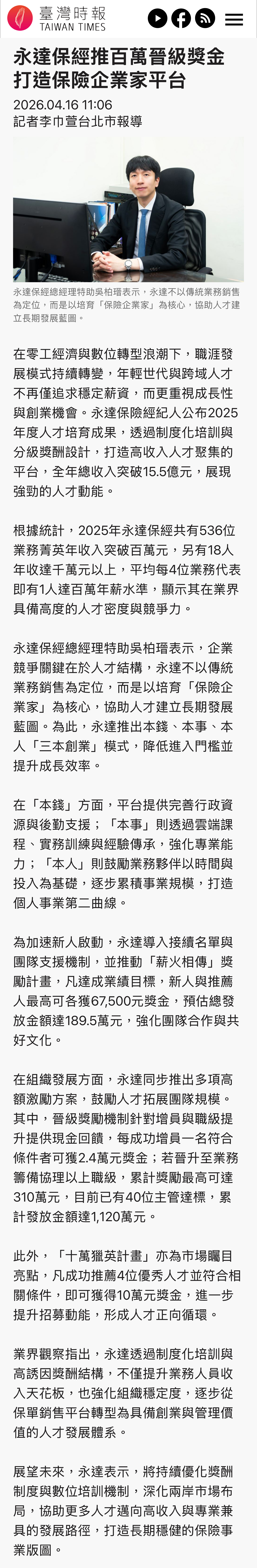 新聞中心 | 2026年永達保經推百萬晉級獎金 打造保險企業家平台 【臺灣時報網路新聞】 2026.04.16在零工經濟與數位轉型浪潮下,職涯發展模式持續轉變,年輕世代與跨域人才不再僅追求穩定薪資,而更重視成長性與創業機會。永達保險經紀人公布2025年度人才培育成果,透過制度化培訓與分級獎酬設計,打造高收入人才聚集的平台,全年總收入突破15.5億元,展現強勁的人才動能。…(詳報導如下)