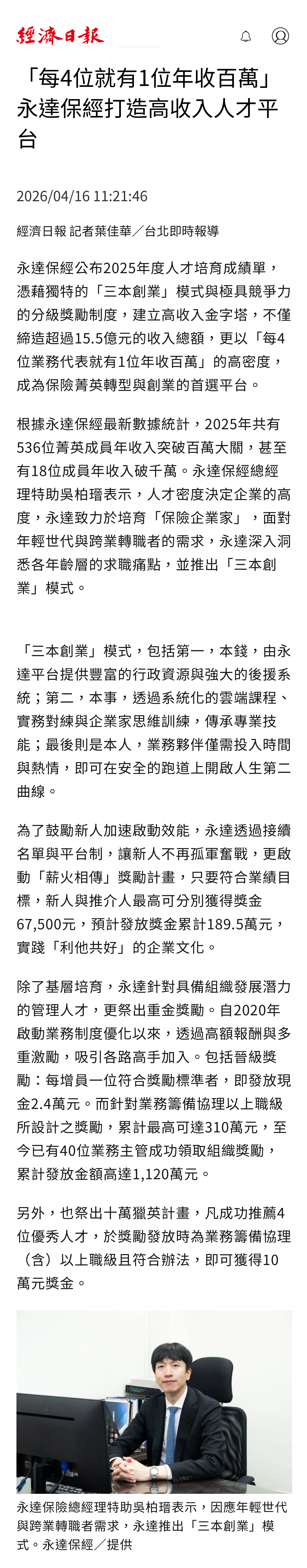 新聞中心 | 2026年「每4位就有1位年收百萬」 永達保經打造高收入人才平台 【經濟日報網路新聞】 2026.04.16永達保經公布2025年度人才培育成績單,憑藉獨特的「三本創業」模式與極具競爭力的分級獎勵制度,建立高收入金字塔,不僅締造超過15.5億元的收入總額,更以「每4位業務代表就有1位年收百萬」的高密度,成為保險菁英轉型與創業的首選平台。…(詳報導如下)