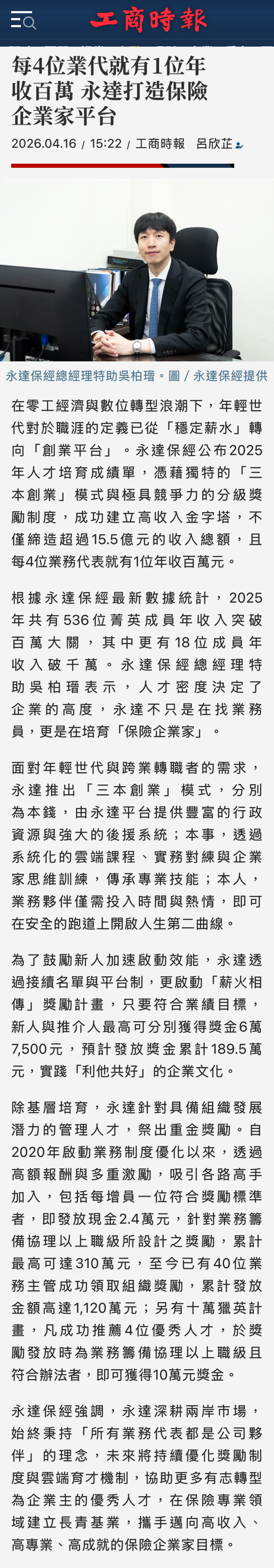 新聞中心 | 2026年每4位業代就有1位年收百萬 永達打造保險企業家平台 【工商時報網路新聞】 2026.04.16在零工經濟與數位轉型浪潮下,年輕世代對於職涯的定義已從「穩定薪水」轉向「創業平台」。永達保經公布2025年人才培育成績單,憑藉獨特的「三本創業」模式與極具競爭力的分級獎勵制度,成功建立高收入金字塔,不僅締造超過15.5億元的收入總額,且每4位業務代表就有1位年收百萬元。…(詳報導如下)