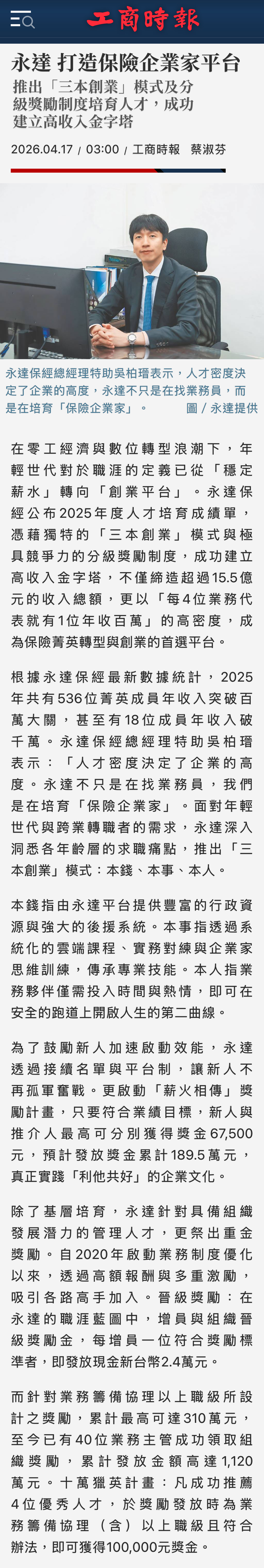 新聞中心 | 2026年永達 打造保險企業家平台 【工商時報網路新聞】 2026.04.17在零工經濟與數位轉型浪潮下,年輕世代對於職涯的定義已從「穩定薪水」轉向「創業平台」。永達保經公布2025年度人才培育成績單,憑藉獨特的「三本創業」模式與極具競爭力的分級獎勵制度,成功建立高收入金字塔,不僅締造超過15.5億元的收入總額,更以「每4位業務代表就有1位年收百萬」的高密度,成為保險菁英轉型與創業的首選平台。…(詳報導如下)